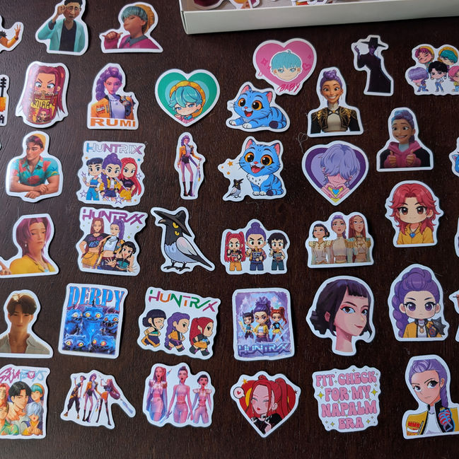 - 60 Assorted KPOP-themed stickers (variety of characters & designs including Hunterix group, Saja boys, Derpy, etc)